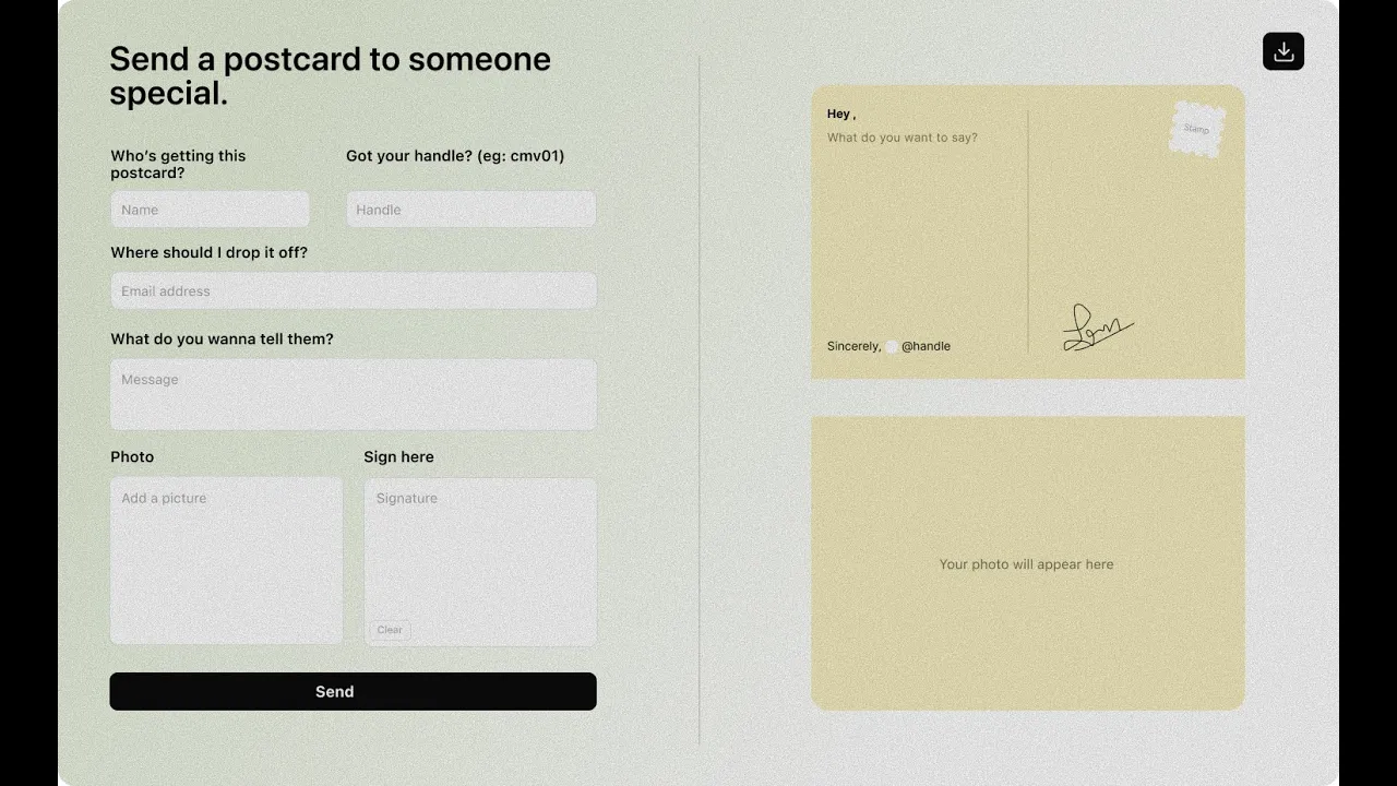 Built an intuitive two-column layout with real-time postcard preview. Designed responsive components for signature drawing, photo upload, and form inputs that work seamlessly across all devices.